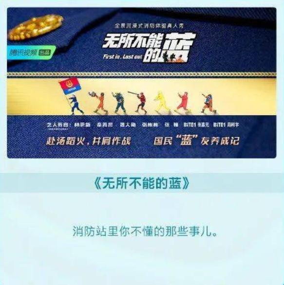 倒是芒果的《无名英雄》让人有几分期待,选择辅警作为切入点,至少从职业选择上接地气了一把。而腾讯视频的《无所不能的“蓝”》,主打明星职场体验,让男艺人体验消防员的日常。