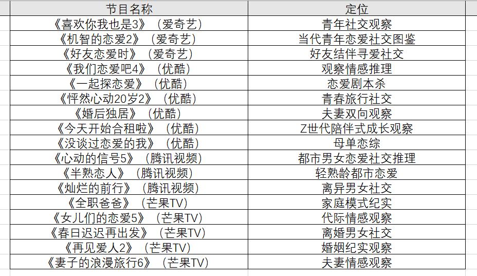 爱优腾芒中,优酷对恋综最上心,一口气推出6档节目。其中既有《我们恋爱吧4》《怦然心动20岁2》这样的老面孔,也有瞄准年轻人恋爱需求的新节目。