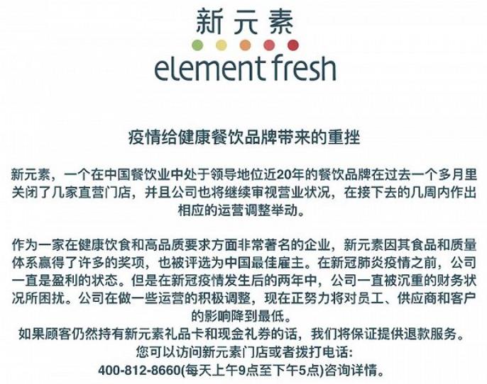 疫情,成为了解释新元素这个轻食赛道的头部品牌倒下的最佳说辞。至少从官方的两次公告中,都将其最终的失败归咎于此。