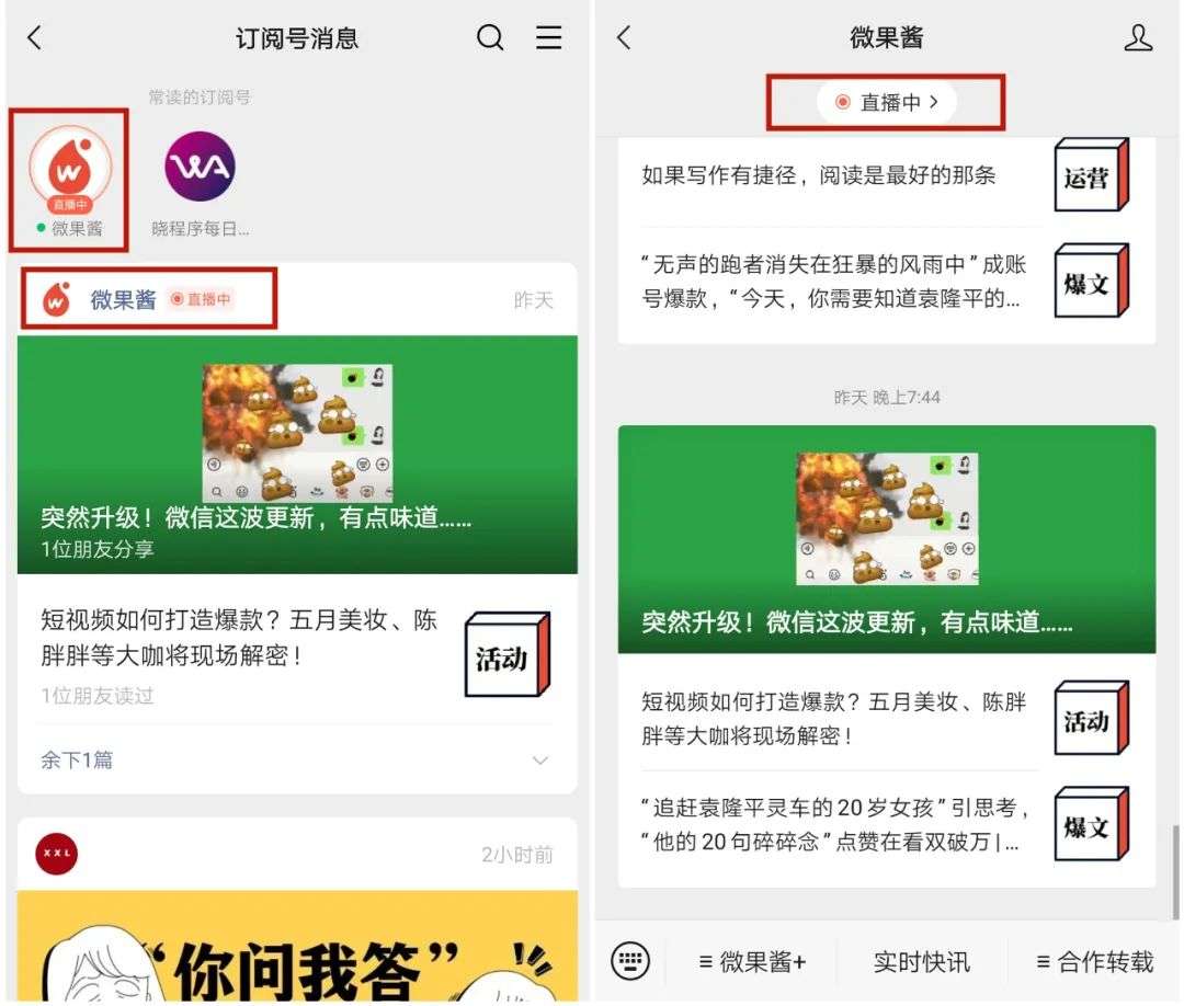 “直播和附近”栏拆分为“直播”和“附近”两个单独入口,足见微信对直播的重视程度。