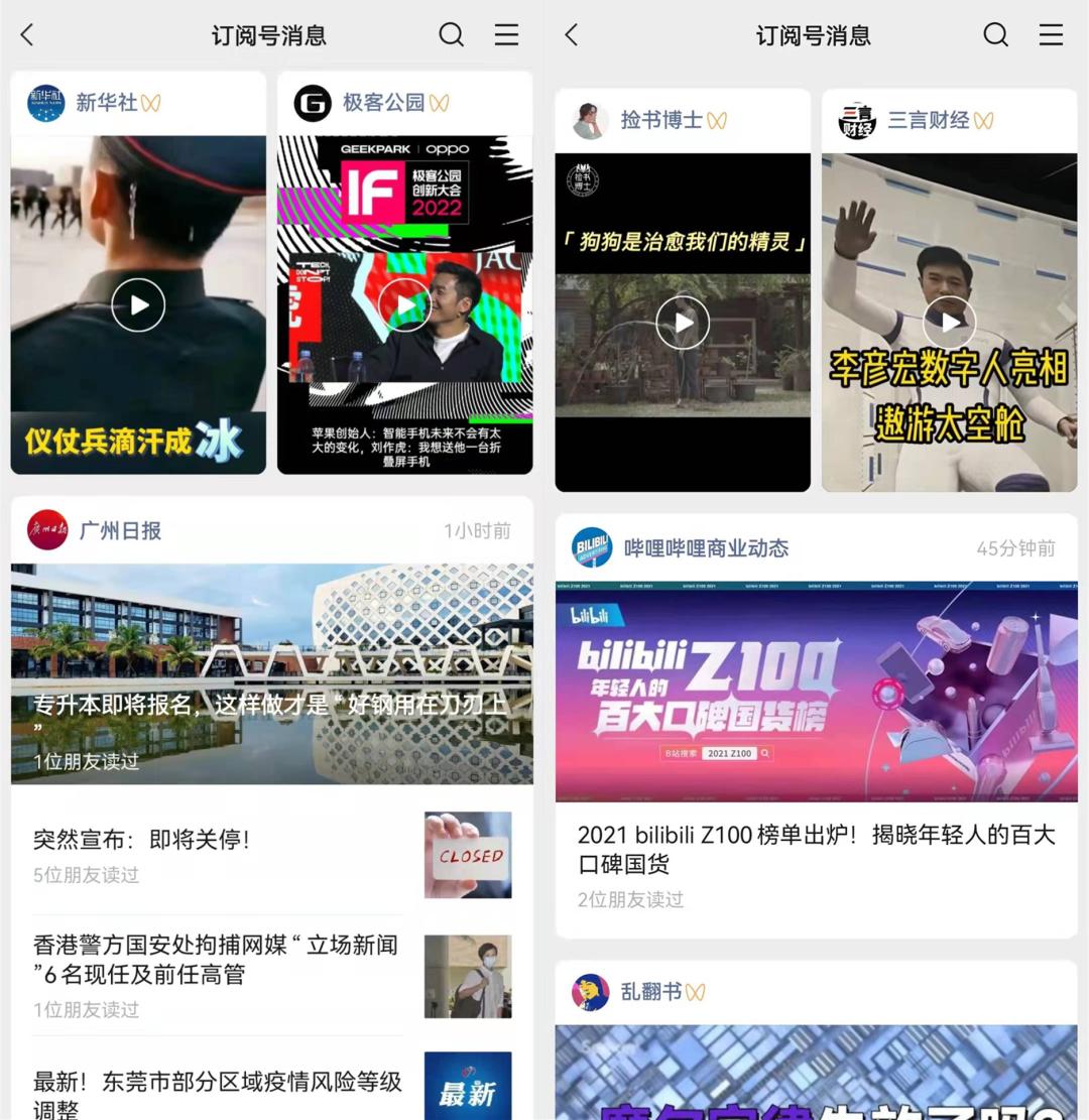 如今的微信保持着“中心化”和“去中心化”的微妙平衡。一方面,“订阅”仍然存续,用户仍然可以通过“订阅”来筛选公众号和视频号的内容,这个路径比起惯用分发逻辑的其他平台而言更加简单。但另一个方面,“订阅”的作用又在不断削弱,从订阅号信息流中推荐模块的出现、订阅帐号内容的折叠、视频号内容的可滑动观看等功能更新可见一斑。