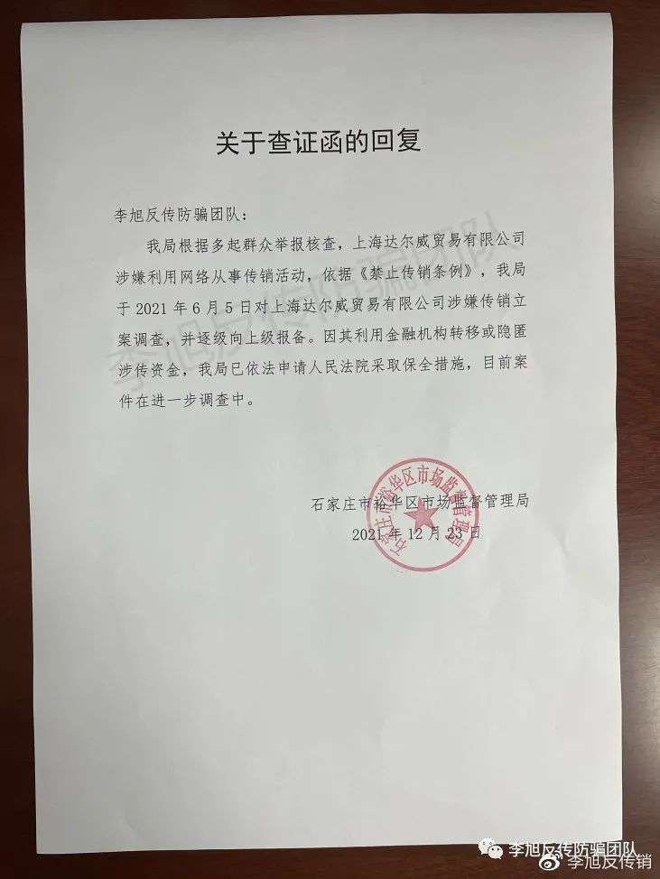 据报道,裕华区市监局反不正当竞争科工作人员称,达尔威具备传销的三个特征,即拉人头、缴纳入门费和团队计酬的金字塔结构。