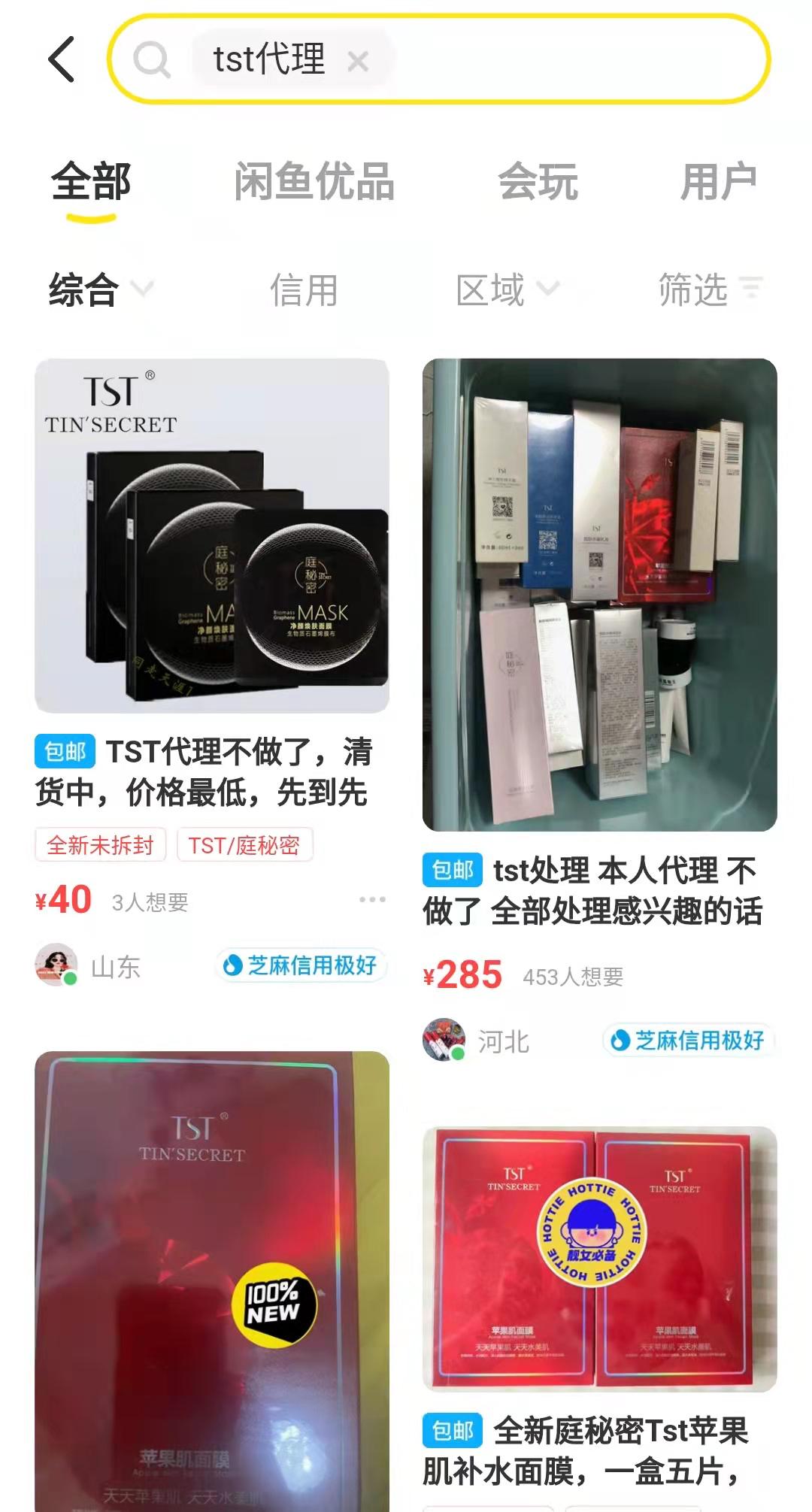 在微博搜索“TST”,出来了清一色的代理。也有代理跑到了闲鱼上,有人不做代理了,要清理库存;有人称自用囤多了出手一点。