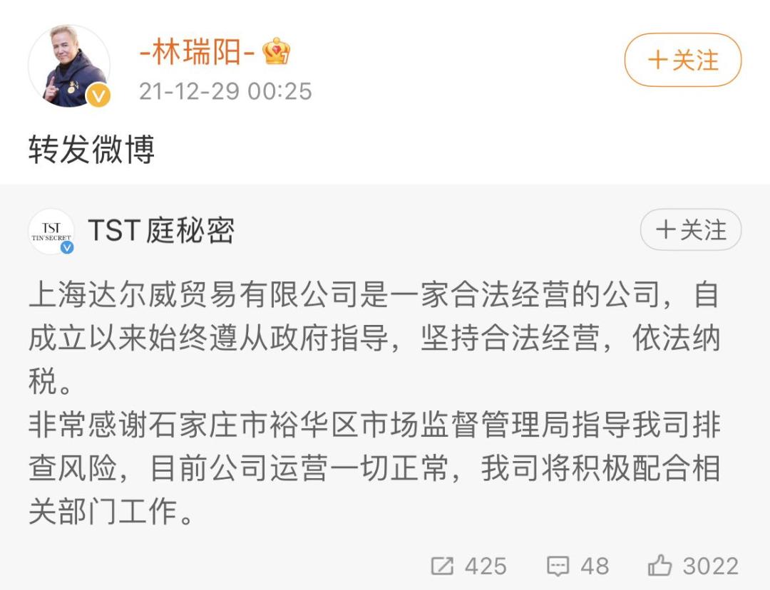对此,今日(12月29日)凌晨,TST庭秘密官微发布声明回应涉嫌传销被查处一事称,上海达尔威贸易有限公司是一家合法经营的公司。公司感谢河北石家庄政府指导排查风险,目前公司运营一切正常,将积极配合相关部门工作。