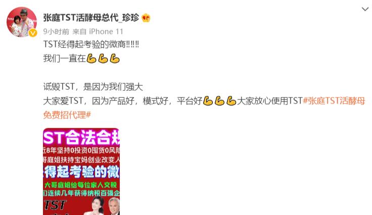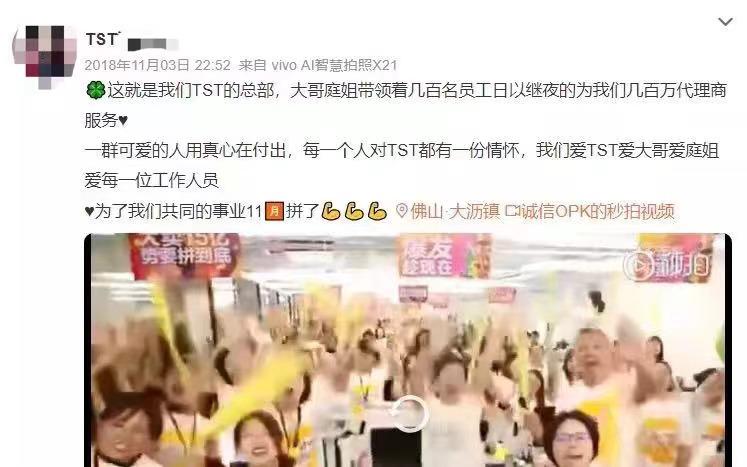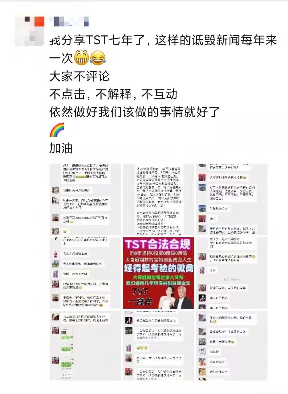 就在张庭林瑞阳公司涉嫌传销消息热议的同时,还有代理在为TST力挺。“TST经得起考验的微商”。