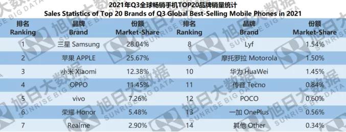旭日大数据统计的“2021年Q3全球畅销手机市场分析报告”显示,三星和苹果在畅销机型上销量占比优势明显,市场份额各占25%,小米在中国厂家阵营领先,份额为12.38%。