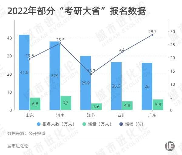 比如,历来盛产“学霸”的山东,已经数年霸榜全国考研报名人数第一名。今年山东考研报名人数在全国率先突破40万,达到41.6万,较去年增加6.8万,增幅达19.5%。