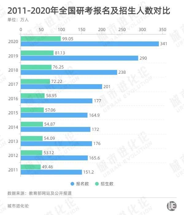 公开数据显示,在2011~2020年的10年间,全国研究生报考人数从151.2万增至341万,增量和增幅分别达到189.8万、125%;高等学校(机构)硕士研究生招生人数从49.46万人增至99.05万,增量和增幅分别为49.59万、100%,明显少于前者。