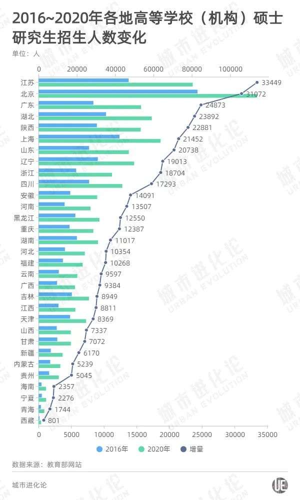 综合教育部网站公布的历年教育统计数据来看,2020年,全国共有6个省份硕士研究生招生人数超过5万,分别为北京(11.4万)、江苏(8.05万)、上海(6.37万)、湖北(5.91万)、广东(5.35万)、陕西(5.33万)。