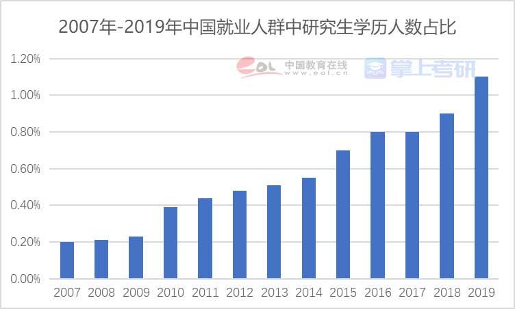 《报告》还指出,伴随就业竞争的加剧,高等教育的普及化,我国用人单位对从业者学历要求越来越高,具有研究生学历的就业者比例也稳步上升——从2007年占比0.2%到2019年上升至1.1%,即每100名就业者中就有1名拥有研究生学历。