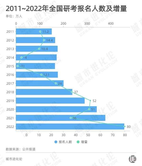 教育部统计数据显示,2022年全国硕士研究生招生考试报名人数为457万,较2021年(377万)增幅达到21%。