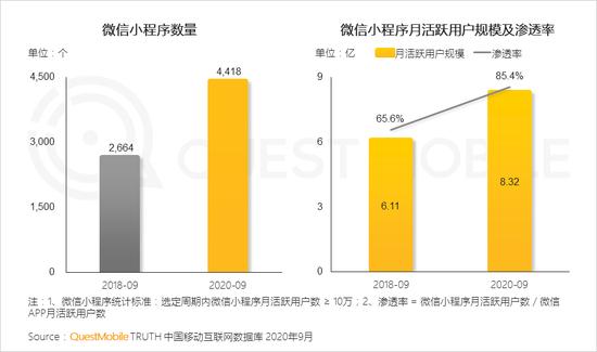 根据QuestMobile数据,2020年9月小程序的月活数已经超过8亿,在微信用户中的渗透率超过85%;月人均使用次数超过50次。
