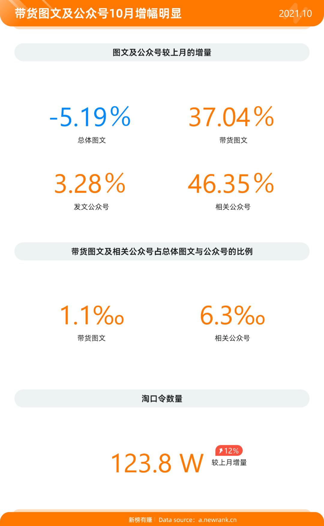 根据新榜有赚10月公众号电商营销报告数据显示,在发文篇数这一指标上,相关带货公众号10月平均发文56.7篇,是非带货公众号的1.78倍。从阅读数来看,相关带货公众号阅读数占当月累计阅读数(272.8亿)的5%左右,单篇带货图文的平均阅读数在4500左右,是非带货公众号图文平均阅读数的8.63倍。