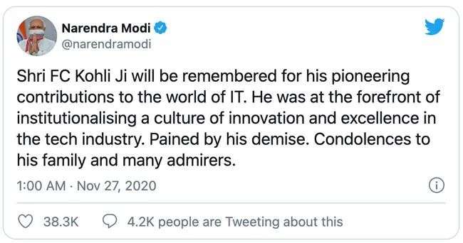 2020年,在96岁的F.C. Kohli去世后,印度官方和民间表示了深切哀悼,称其为“印度IT之父”。