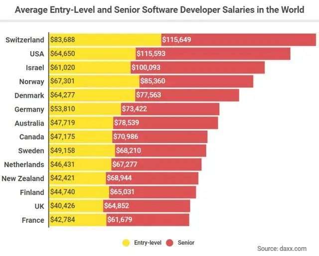 可换到美国,一名软件工程师的平均年薪为10万美元(大约63万元人民币),即使刚刚入门的软件工程师也能拿到最少6万美元(大约38万元人民币)。