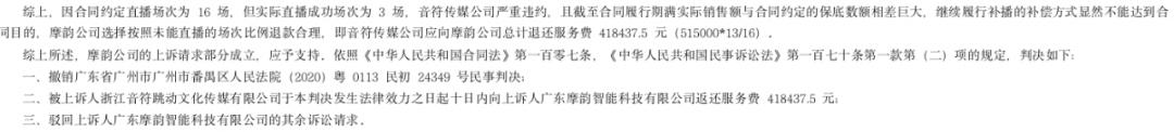 相差近100倍的数字,足够证明此次陈小春直播带货是实打实的“翻车”事故。正是这个令人大跌眼镜的成绩,陈小春背后的MCN机构音符传媒公司被告上了法庭。经审理后,广东省广州市中级人民法院判决,音符传媒向摩韵智能科技返还服务费41.84万元。