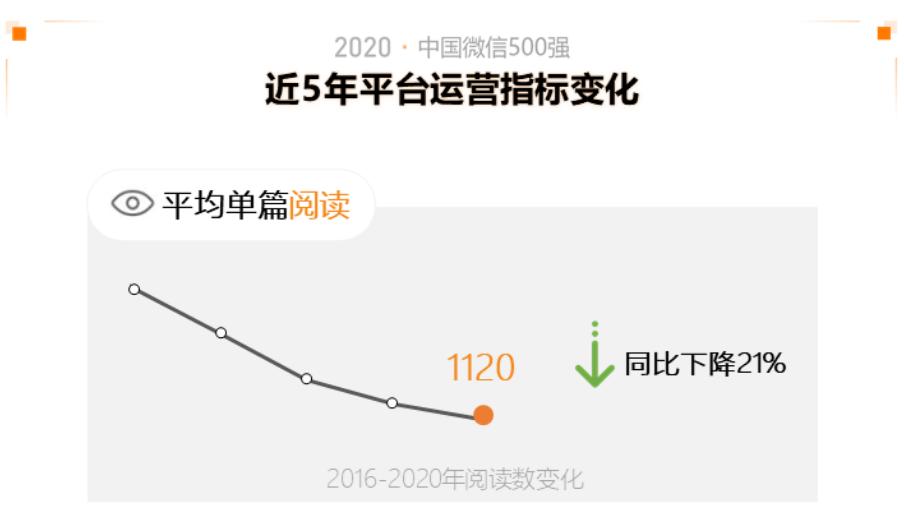 根据新榜发布的《2020中国微信500强年报》,统计过去 5 年的活跃样本(即有监测发文的公众号,含时事政务)的阅读数,单篇文章的平均阅读数持续走低,5 年内降幅达 69.9%(由 2016 年的单篇 3719 个阅读降至 1120)。