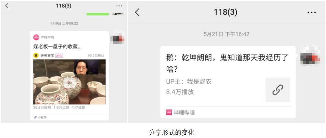 实际上,在小程序的跳转功能被禁止后,确实有不少开发者将引导跳转、下载APP的主阵地转移到了H5网页。比如B站,功能取消之前,用户从APP分享的视频在微信聊天页面里以小程序卡片呈现,而之后便重新回到了网页链接形式。