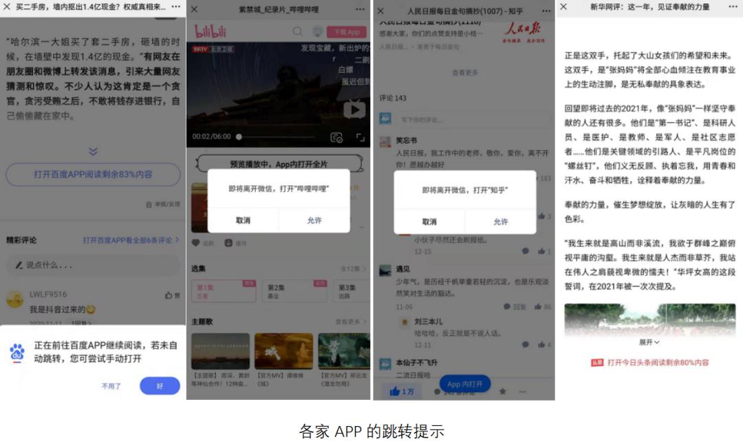 跳转APP阅读剩下内容,打开APP查看全部评论......这些提示最为典型,本来在浏览器内就可以完成的基础服务,受限之后只得转移到另一个APP,甚至有的会在未经用户许可的情况下自动跳转。之于用户体验,何尝不是隔绝信息的又一围栏?
