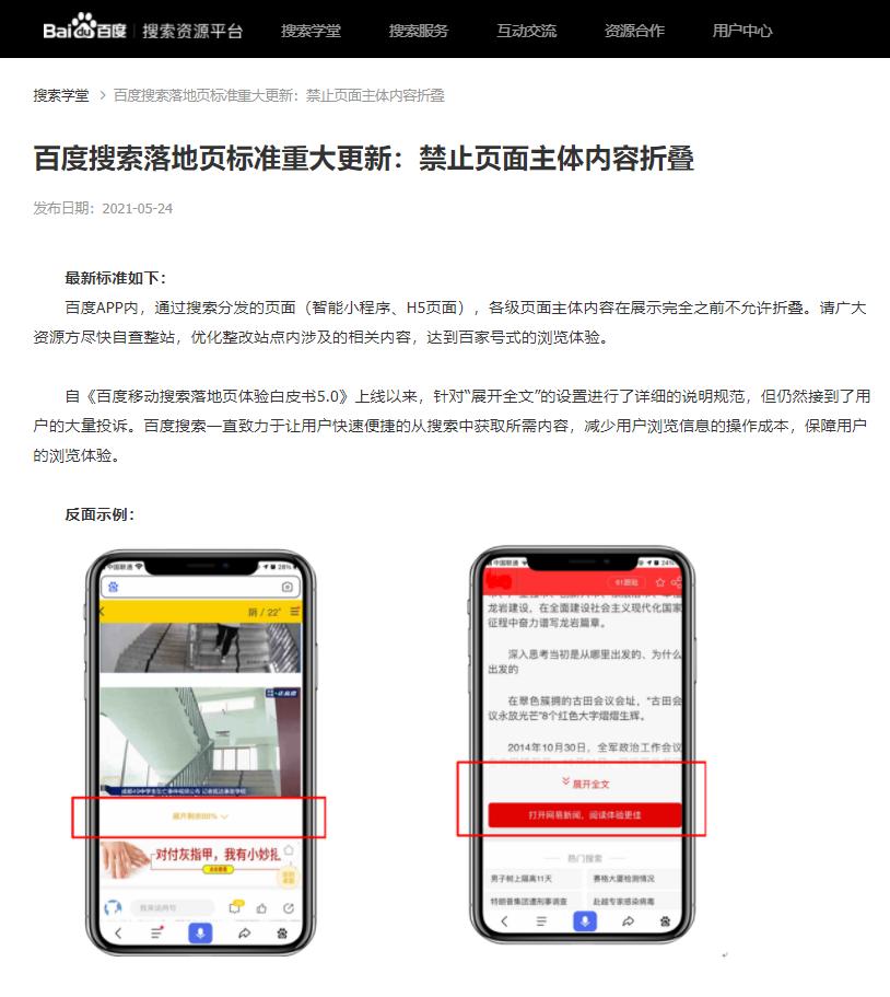 2021年5月,百度还专门针对百度APP内的跳转现象发布了一条禁令,要求通过搜索分发的页面(智能小程序、H5页面),各级页面主体内容在展示完全之前不允许折叠。以此“减少用户浏览信息的操作成本,保障用户的浏览体验”。