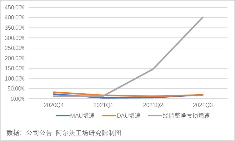 但如果观察MAU、DAU与亏损之间的走势,会发现情况并不乐观。从今年一季度开始,快手的亏损增速就开始飙升,三季度高达401.4%,远超同期MAU、DAU的增长。