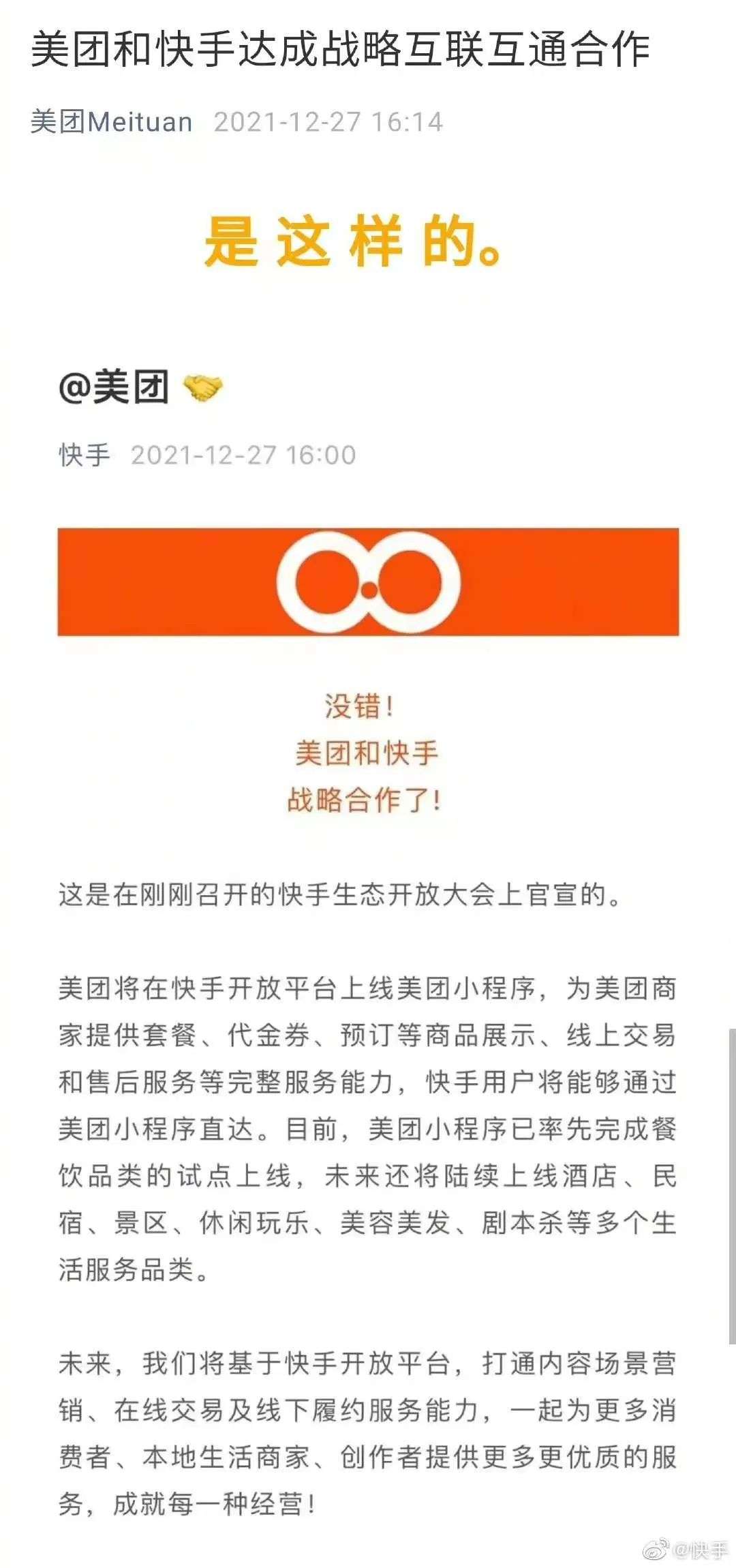 继微信开放外链后,“互联互通”又有了新一步进程。12月27日,快手与美团宣布达成互联互通战略合作。双方将基于快手开放平台,打通内容场景营销、在线交易及线下履约服务能力,共同为用户创造“一站式”完整消费链路。