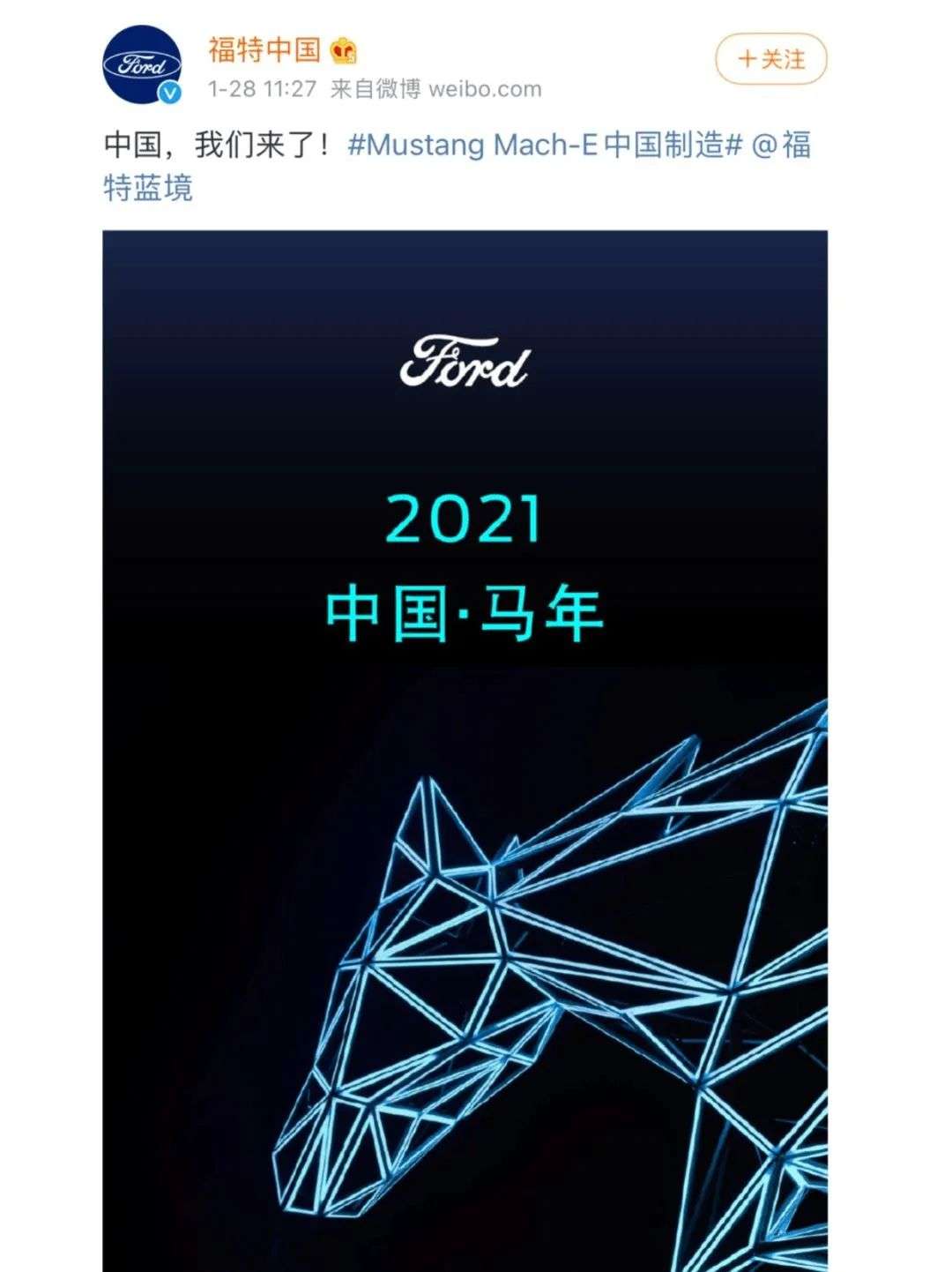 还有一个生肖的案例是去年1月28日,福特中国在其官方微博上发布了一张海报,海报上显示“2021中国·马年”。