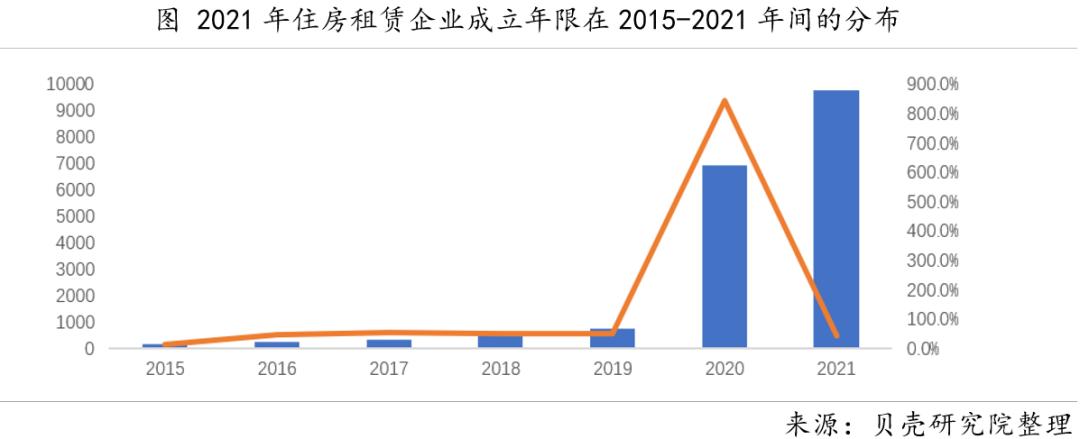 数量方面,住房租赁企业数量已达万级规模。根据国家企业信用信息网公布的企业数据测算,2021年主营业务为房地产业,经营范围涵盖“住房租赁”,实际经营的住房租赁企业已达2万家左右,其中8成为近两年成立。自去年以来,中央和地方陆续出台监管政策,有效降低了租赁企业的经营风险,住房租赁企业迎来了良性的市场竞争环境,租赁行业呈现快速发展态势。