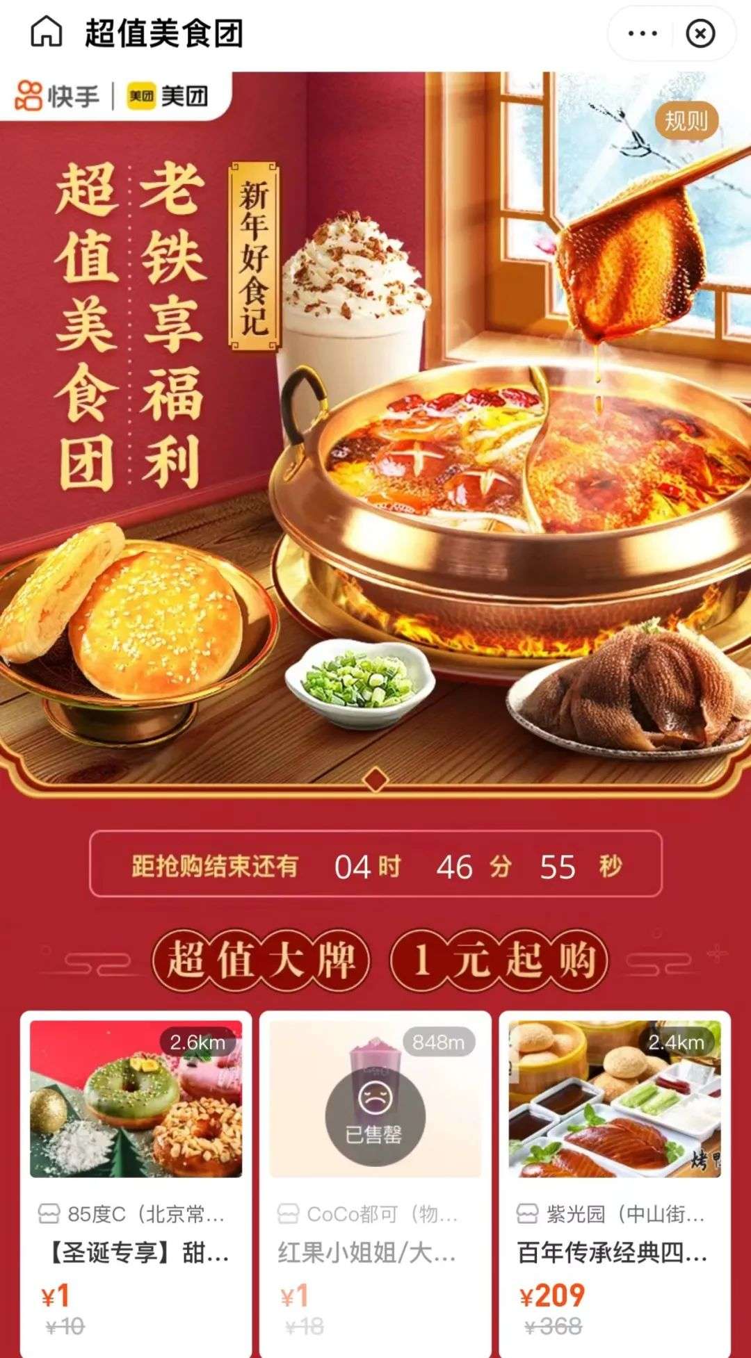 除此之外,目前在快手App的小程序页面,也可以看到美团与快手联合开展的超值美食团活动,首批入驻快手美团小程序的商家提供了远低于其他平台的优惠套餐,并且在各个套餐的右上角部位还标注了用户与商户的距离。如此一来,用户即可根据自身所处地理位置,选择距离自己较近的商家消费。