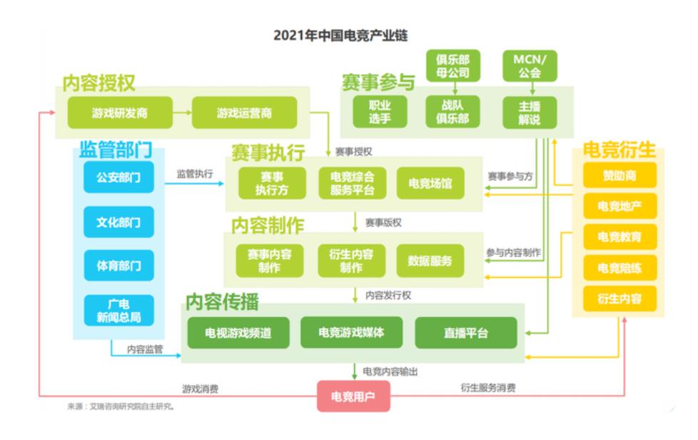 艾瑞咨询发布的《2021年中国电竞行业研究报告》显示,电竞产业链主要分为上游内容授权、中游赛事和下游内容传播三大部分,可见电竞产业中不仅包括电竞行业,还包括游戏行业和传媒行业。
