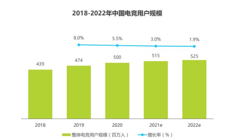 艾瑞咨询数据统计,按照半年内至少观看过或参与过核心电竞游戏赛事(包括职业和非职业赛事),或者每周频繁玩核心电竞游戏或观看相关直播的用户计算,目前我国电竞用户规模已达到5亿人。