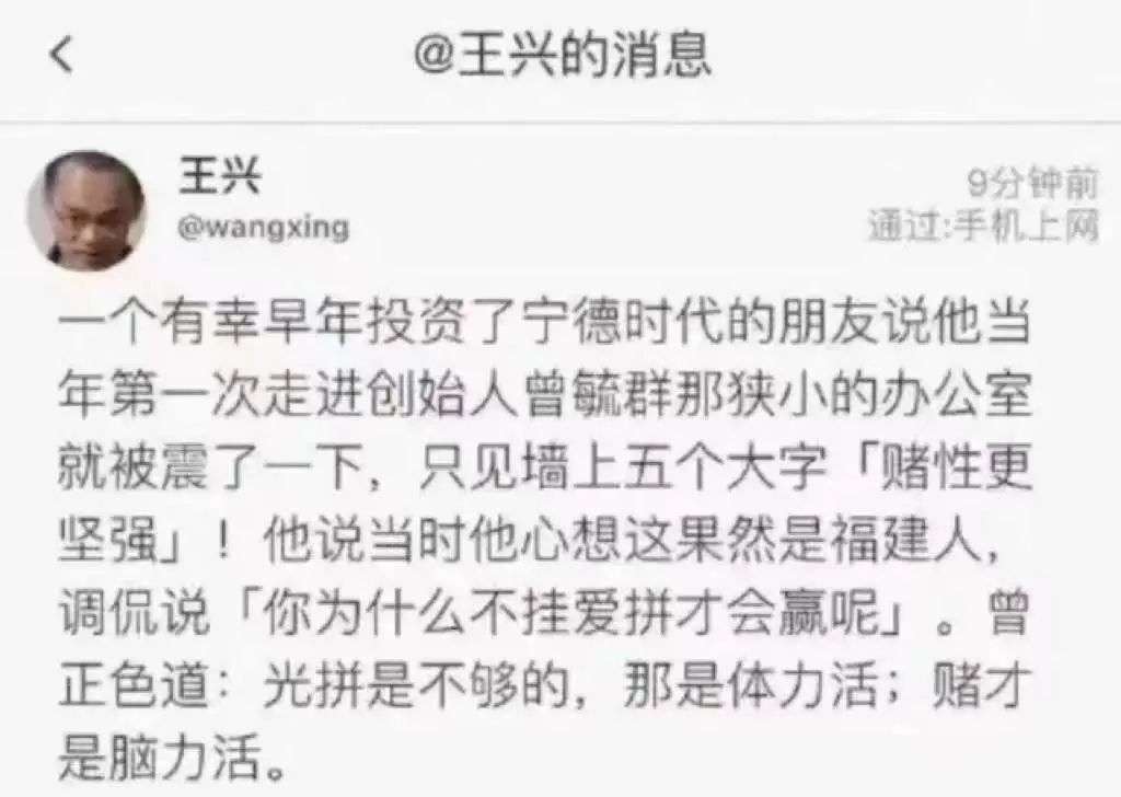 一位宁德时代早期投资人第一次去曾毓群办公室时,被墙上“赌性坚强”的字画所震惊,这位投资人问为什么不挂“爱拼才会赢”,曾毓群正色回答道,“光拼是不够的,那是体力活;赌,才是脑力活”。这事美团的王兴还在他的饭否上发过。