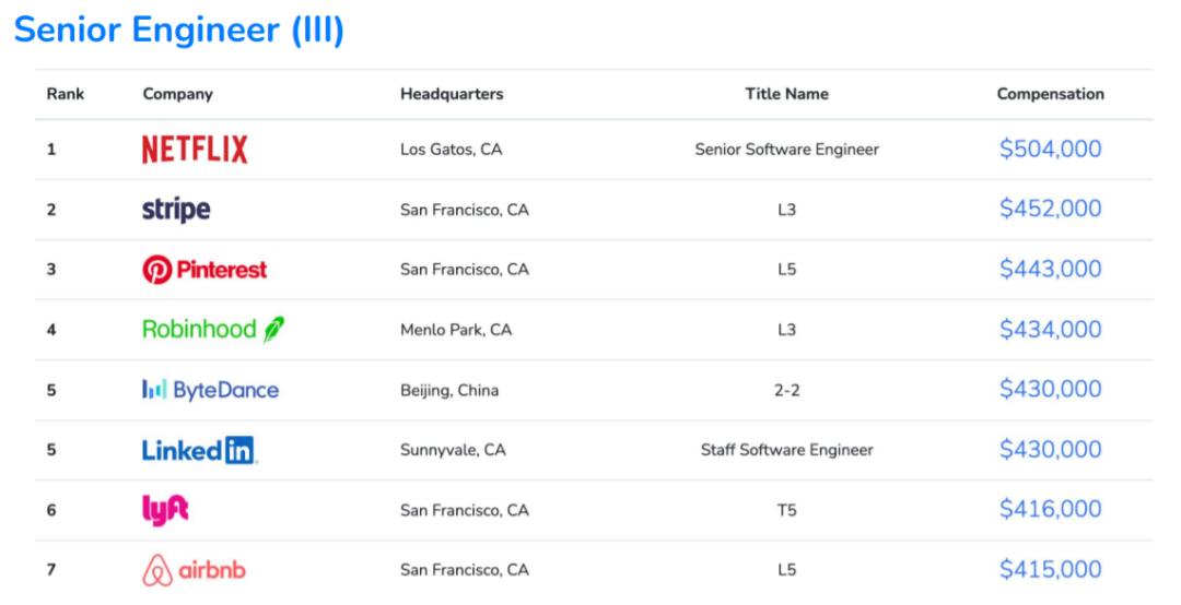 数据显示,Netflix(网飞)高级工程师年薪位列第一,字节跳动以43万美元排世界第五。