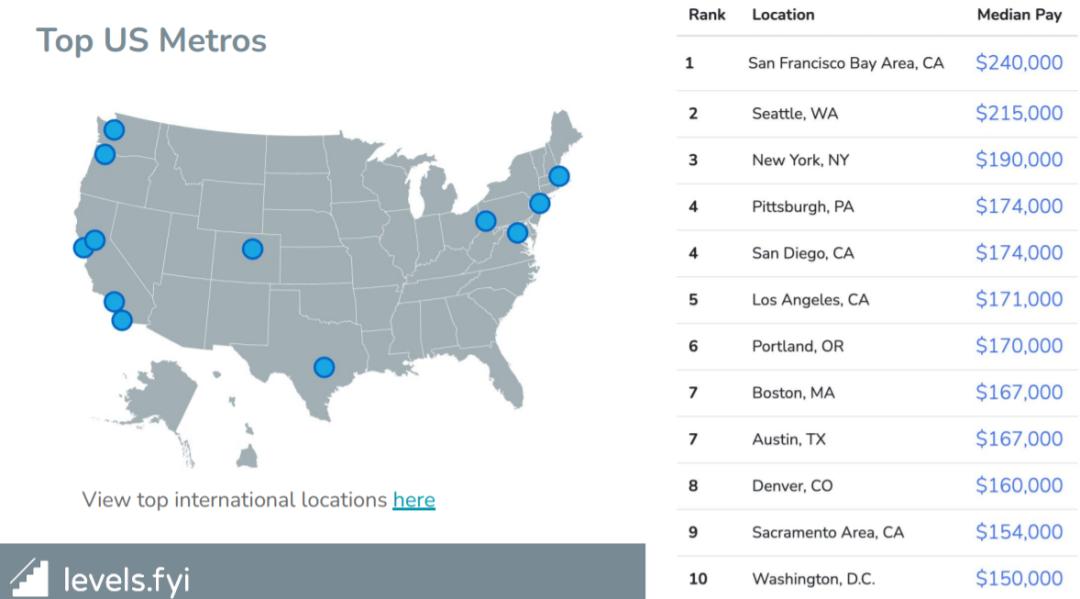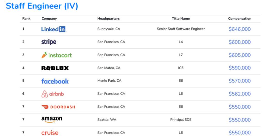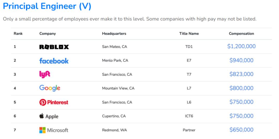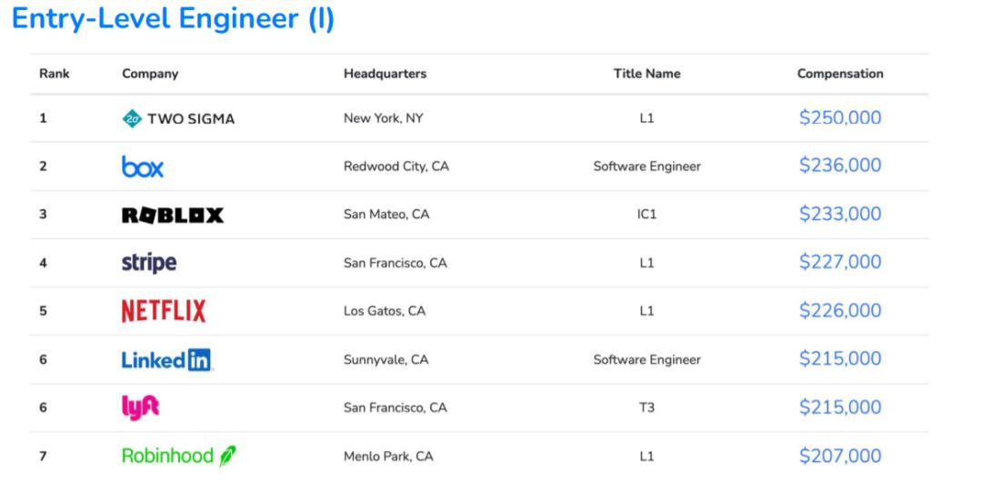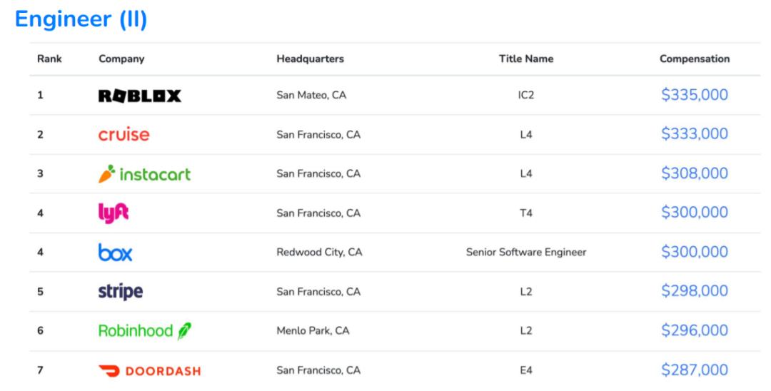 最近随元宇宙概念大火的沙盒游戏开发商Roblox为这一级别的工程师开出了33.5万美元的年息,排名第一。在前十榜单上,大部分工程师的年薪中位数超过30万美元。