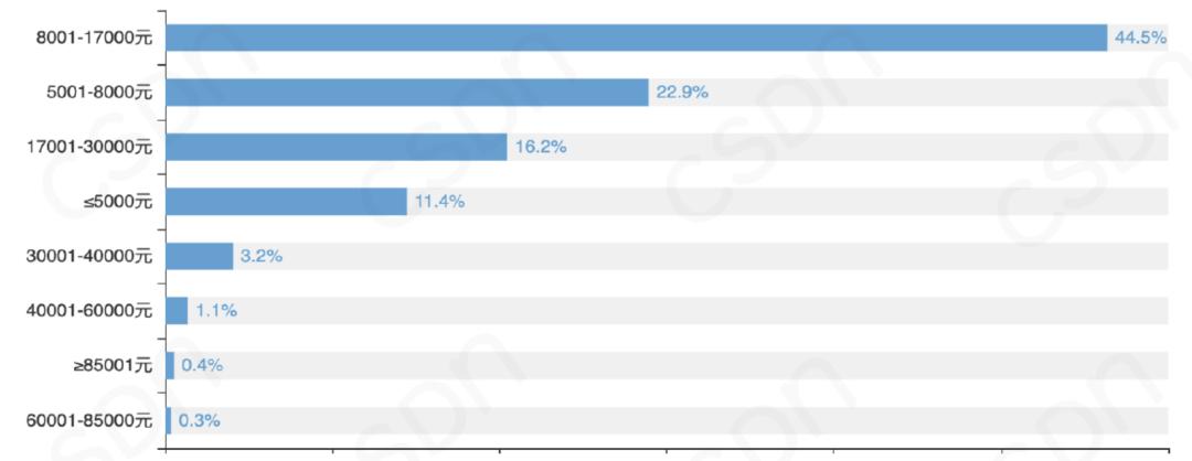 近九成的开发者工资在5000元以上,8001-17000元区间的开发者占比最高,为44.5%。月薪低于5000元的开发者占11.4%。