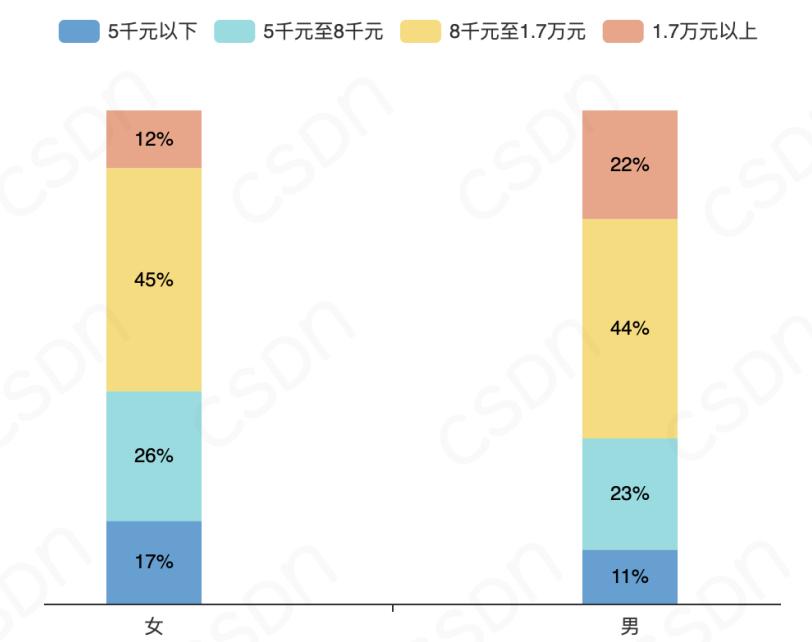 在月薪超过1.7万元的同等区间下,男性开发者占22%,女性开发者占比仅为12%。不过,月薪8千——1.7万区间的男女开发者比例基本持平。
