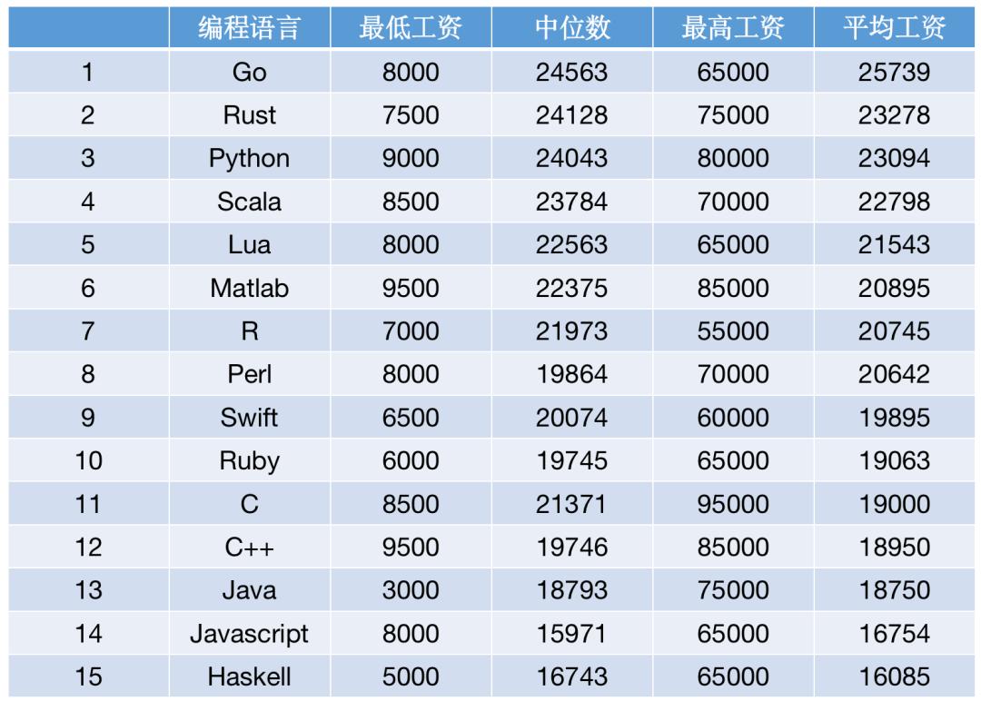 从编程语言看,薪资榜首是Go语言,平均薪资达到25739。其次排名第二的是Rust,平均薪资达到了了23278元;第三的就是我们比较熟悉的Python,平均薪资是23094元。