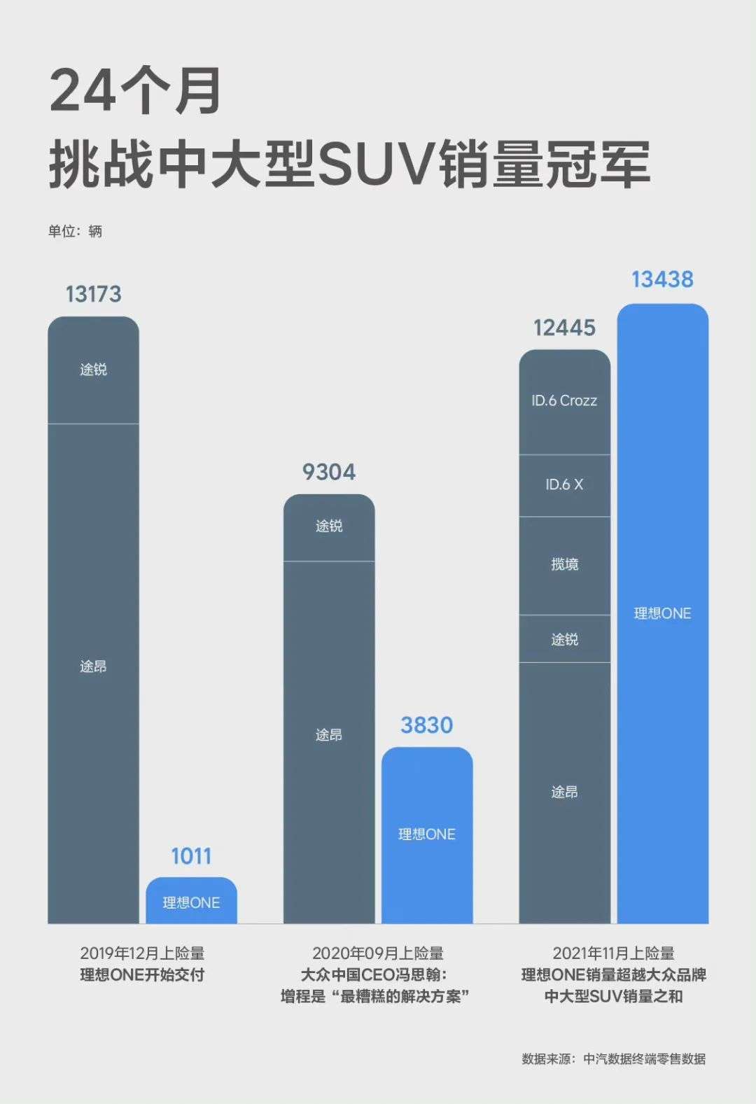 直到前些天,理想CEO李想发布了一张“24个月挑战中大型SUV销量冠军”的统计图,矛头直指大众中大型SUV。