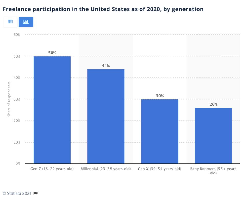 从2020年美国自由职业者的年龄分布可以看出,这种工作形态在年轻一代中渗透率更高 ——Z世代在自由职业市场的参与度高达50%。