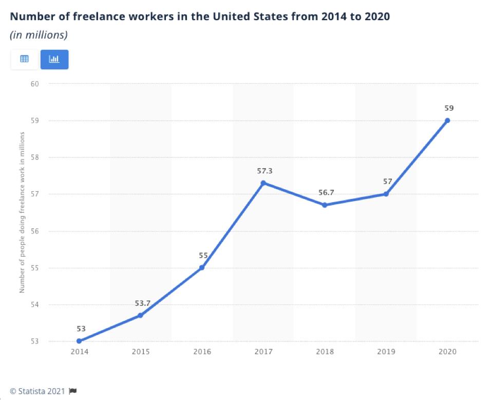 Statista数据显示,2020年,美国有5900万人全职从事自由职业,较2019年增加了22%。美国自由职业集市平台Upwork在名为《Freelance Forward》的年度报告中称,这一数字占美国劳动力的三成以上(36%)。该报告还指出,目前需求最高的自由职业出现在计算机/数学、以及金融/商业运营行业。