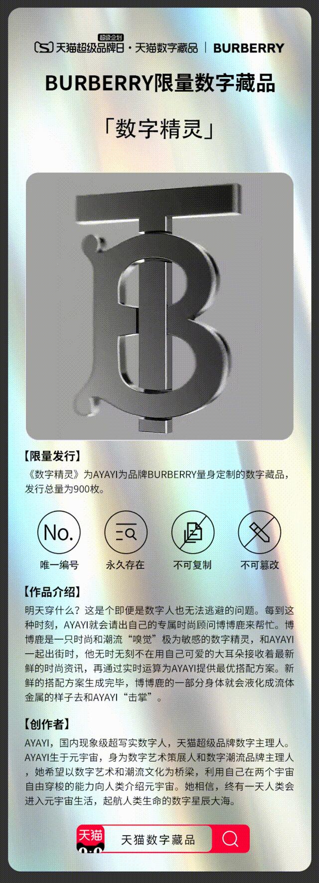 在10月天猫数字藏品活动中,有一个以BURBERRY经典的博博鹿形象打造的数字藏品,名叫“数字精灵”。在其介绍中,“数字精灵”是超写实数字人AYAYI为BURBERRY量身定制的数字藏品。