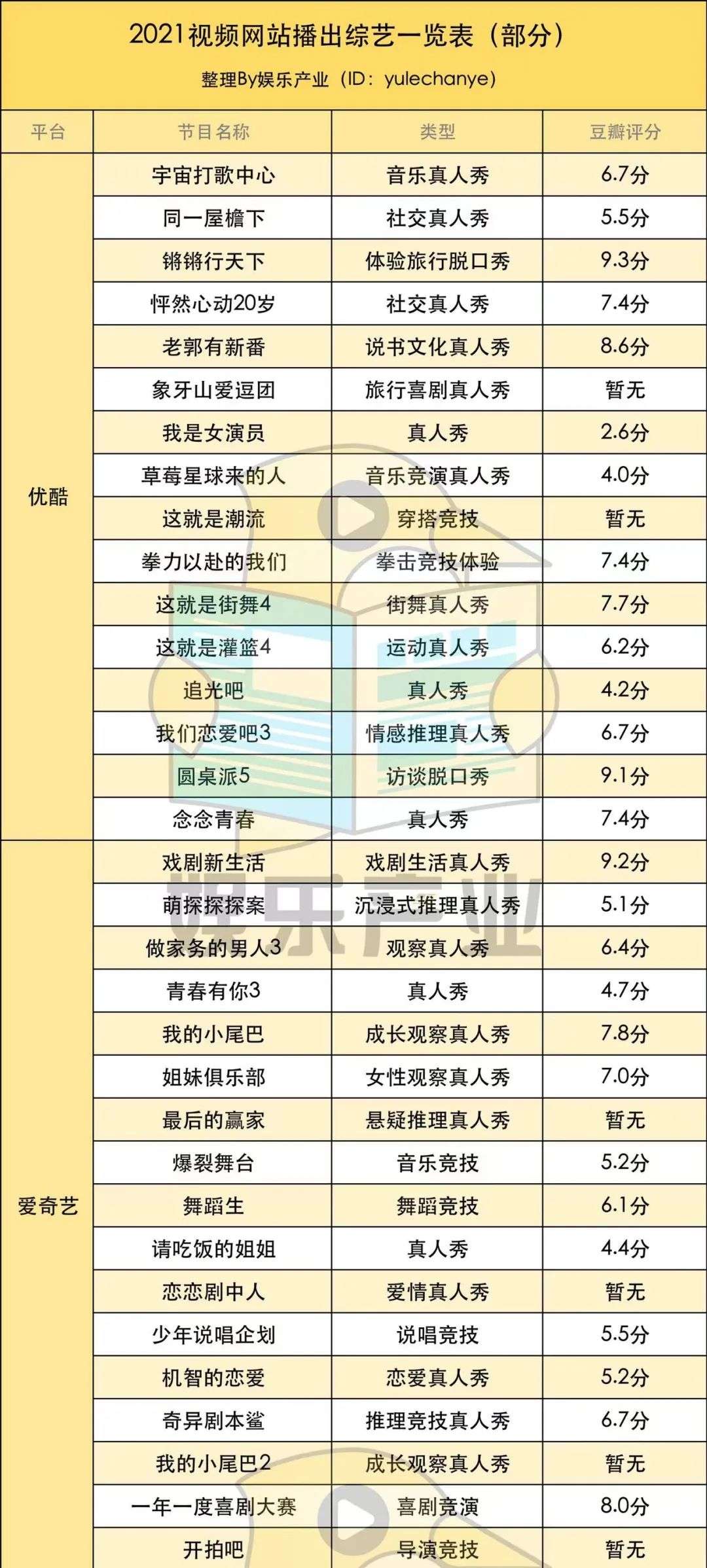 年初《戏剧新生活》豆瓣9.2分,年末《一年一度喜剧大赛》豆瓣8.0分,两个综艺都是2021豆瓣最受关注的十大综艺之一,爱奇艺综艺算是开了个好头,结了个好尾。但整个2021,爱奇艺的综艺赛道还是有点坎坷。
