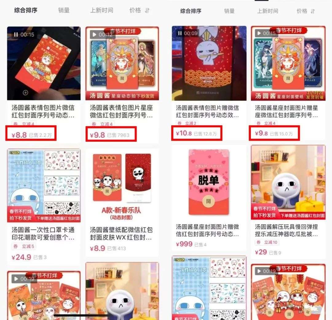 733.5万粉丝的抖音博主汤圆酱,12月初在抖店悄悄上线了自制的微信红包封面,店铺页面显示,一张9.8元的微信红包封面销量已超15万份,且目前仍在以每天卖出1万多份的速度被抢购。