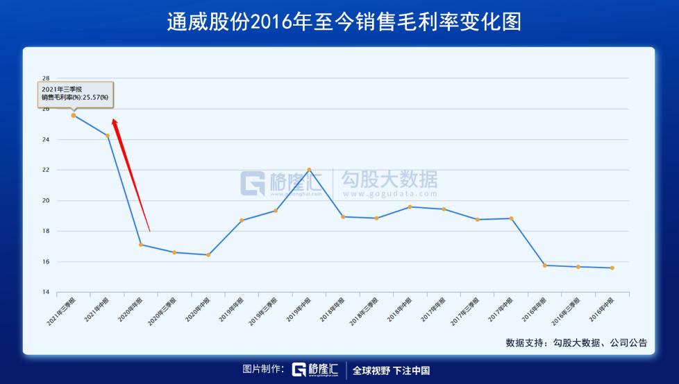 今年是硅料企业丰收的一年。截至今年前三季度,硅料龙头老大通威股份实现营收467亿元,同比增长47.42%;其归母净利润达到59.45亿元,同比大增78.38%。其销售毛利率今年也是陡然上升,第三季度达到25.57%,创下近5年来单季度最高记录。