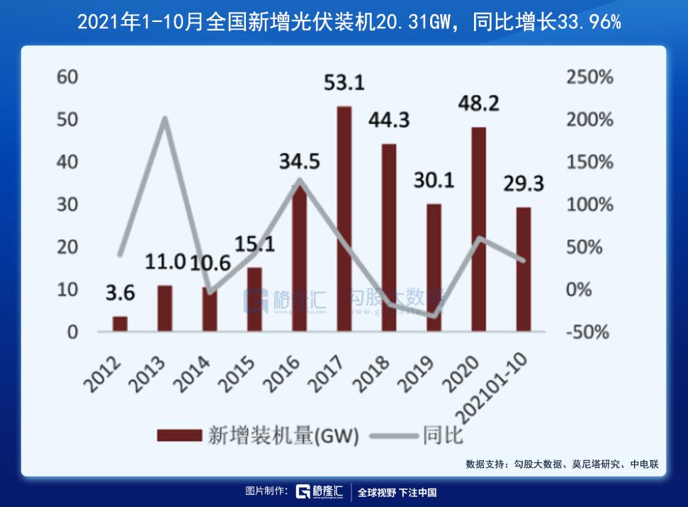 国家能源局数据显示,2021年1-10月,全国新增光伏装机29.31GW,同比增长33.96%,距离中国光伏行业协会预测的全年55-65GW的新增装机量还有不小的距离。