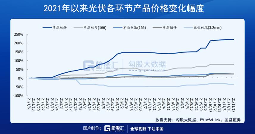 2021年,光伏赛道的涨价潮从年初持续至年尾,从产业链上游的硅料蔓延至下游的电池片与组件。其中,硅料价格飙涨尤甚。PVinfolink报价显示,截至2021年11月17日,多晶硅致密料价格涨至269元/kg,年内涨幅达到220.2%。
