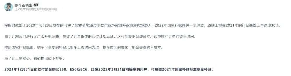 其中,蔚来在12月1日便发布公告,只要在12月31日前订车(ET5/ET7除外),并在3月31日前提车,均可享受2021年补贴标准(由于政策鼓励发展换电车辆,所以蔚来不受“售价30万以下”标准限制)。