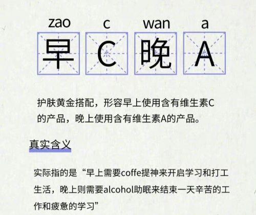 而2021年的“C”和“A”,却有了新的含义。2021版“早C晚A”,指早上需要Coffee (咖啡) 提神来开启学习和打工的生活,晚上则需要Alcohol (含酒精饮料) 助眠来结束一天辛苦的工作和疲惫的学习。