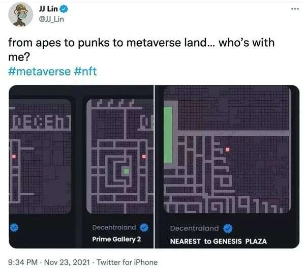 2021年11月23日,著名歌手林俊杰也在推特上宣布,自己购买了Decentraland平台上的三块虚拟土地,正式涉足元宇宙。他购买这三块“地皮”据估算花了大约12.3万美元(约78.72万元人民币)。