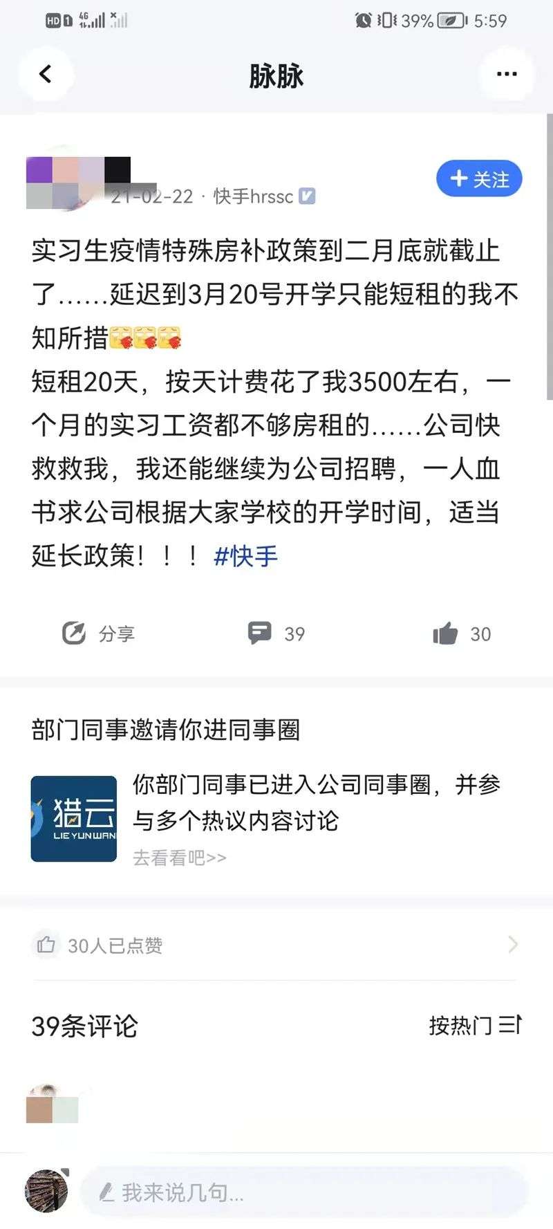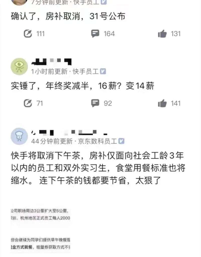 根据快手实习生在平台爆料显示,明年2月底将取消房补。对此,部分实习生面临着开学日期和房补取消时间不接轨的情况。2月底取消房补后3月底开学,这期间的房租费用超过了实习期工资。同时,12月30日下午,有认证为快手员工的网友在平台表示“实锤了,年终奖减半,16薪变14薪。”